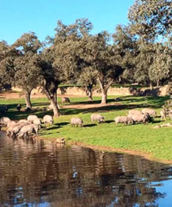 - El jamón proviene de cerdos de raza ibérica criados en campos y alimentados a base de hierbas aromáticas, leguminosas y cereales naturales, ricos en sodio, fibra y proteínas. En el corte se pueden apreciar pequeñas «motas» o «cristales» de color blanco, señal de una curación lenta y una baja salinidad.